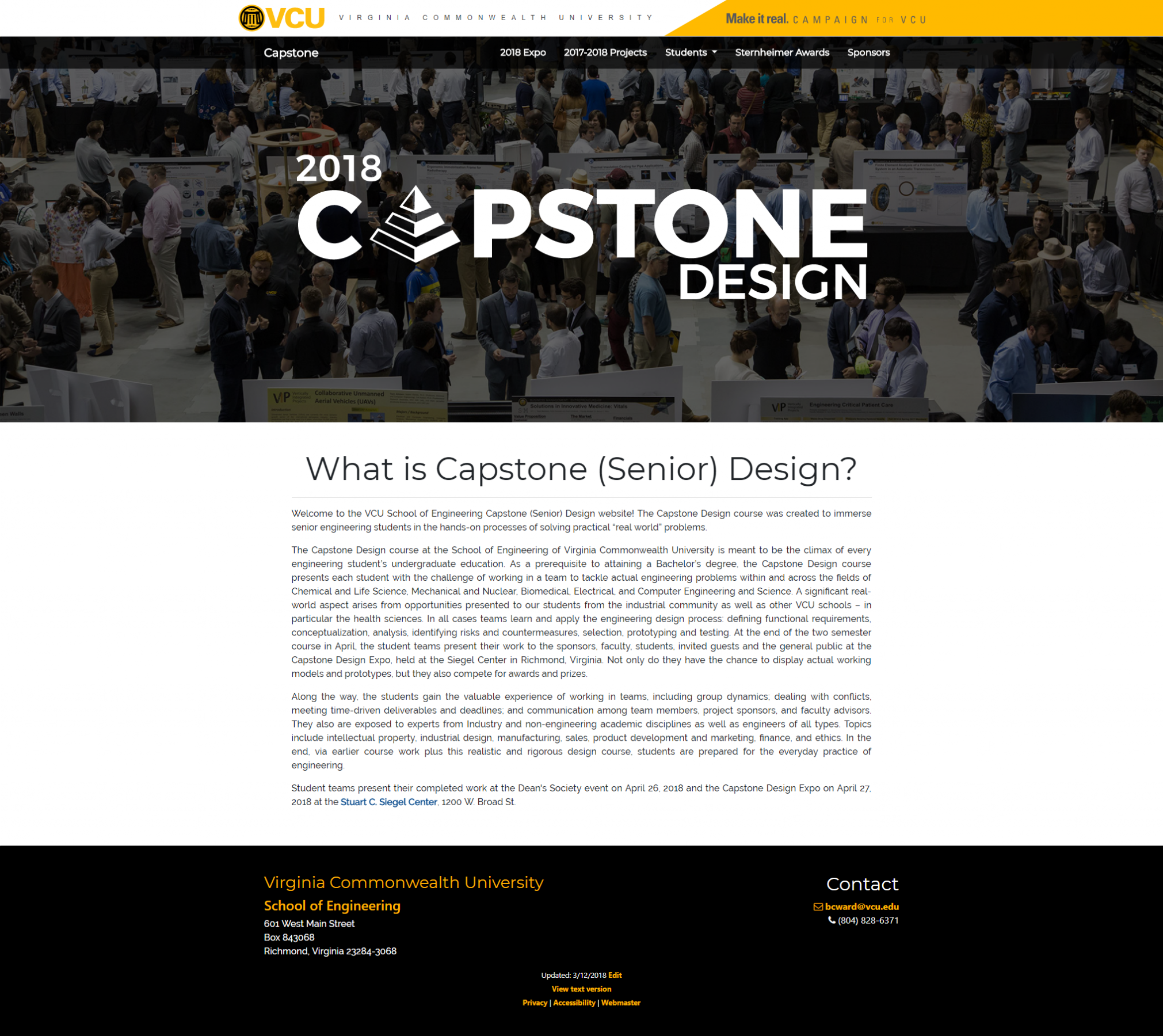 In previous years, Capstone Design has been hosted on as a general page within the primary School of Engineering website. As this is a premier event that is the culmination of the undergraduate student's efforts, it needed to stand out from other yearly events to showcase what impacts these emerging engineers can have on the world.